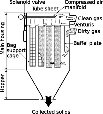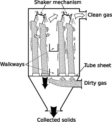 In Mechanical-Shaker baghouses, tubular filter bags are fastened onto a cell plate at the bottom of the baghouse and suspended from horizontal beams at the top. Dirty gas enters the bottom of the baghouse and passes through the filter, and the dust collects on the inside surface of the bags.